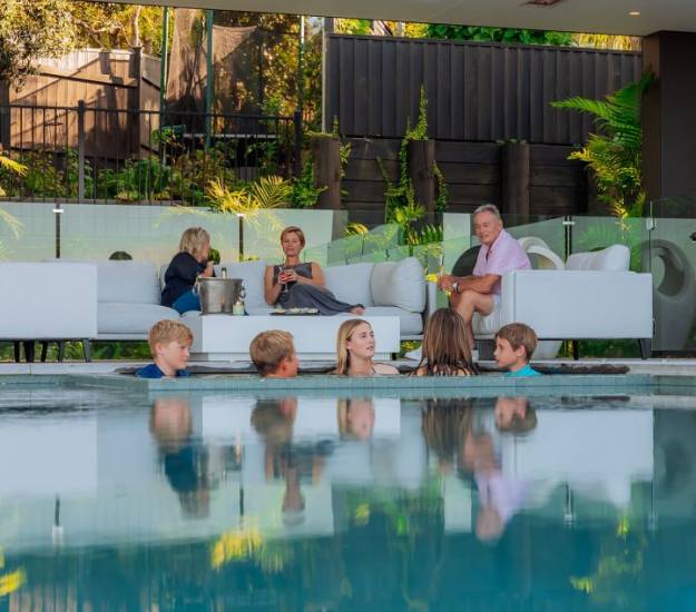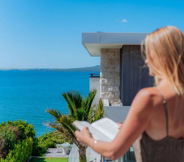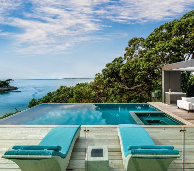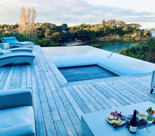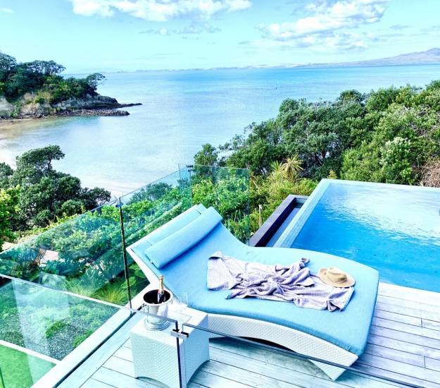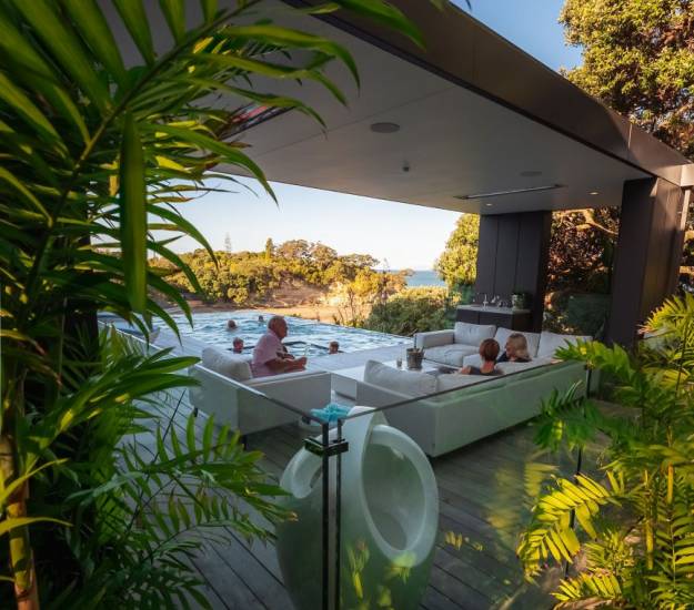 Our relaxed accommodation on the North Shore of Auckland provides you with a calming retreat where you can walk along the beach with your morning coffee, meditate on the deck connecting you to the elements looking out over Castor Bay, practice yoga in our peaceful yoga room or simply curl up with a good book in front of the fire with some old vinyl records playing in the background. Relax in the infinity pool and spa nestled under the iconic pohutakawa, or spend time on the sun loungers or under cover in the outdoor lounge...How you spend time at Elements is for you to decide.